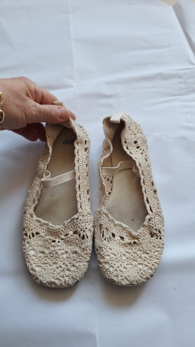 Bej renkli, dantelli ve örgü kumaştan yapılmış, bohem tarzında kız çocuk babet ayakkabı. Pastel tonlarda yumuşak dokulu.