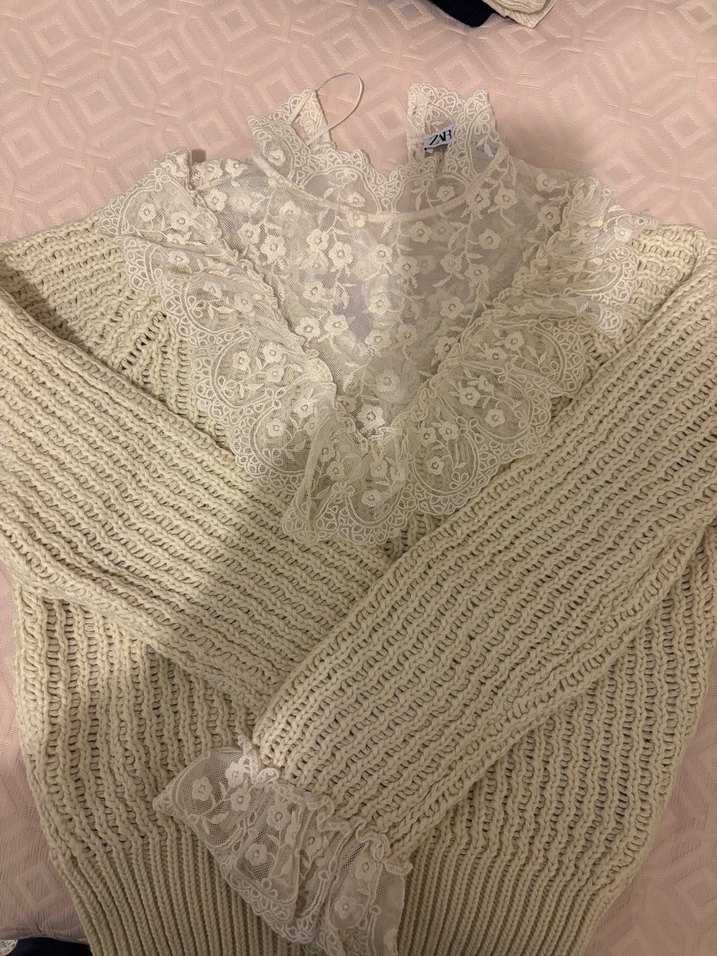 Bej renkli, dantel işlemeli yakası ve uzun kollu, bohem tarzda, vücuda oturan triko kazak, rahat kullanım için uygundur.