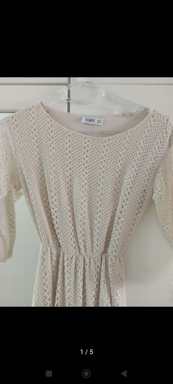 Bej renkte, dantelli detaylara sahip midi uzunlukta triko elbise. Yuvarlak yaka ve salaş kesimlidir, askılı kollu ve bohem tarzda tasarlanmıştır.