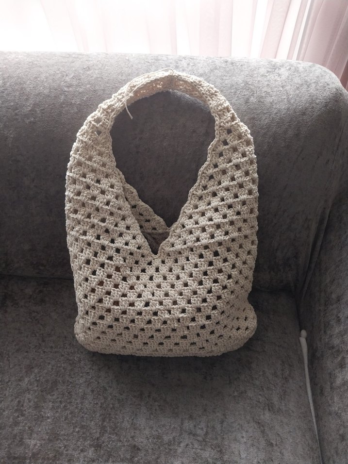 Bej renkli, dantelli örgü kumaştan yapılmış bohem tarzda kadın çantasıdır. Rahat ve retro görünüm için uygundur, desensizdir.