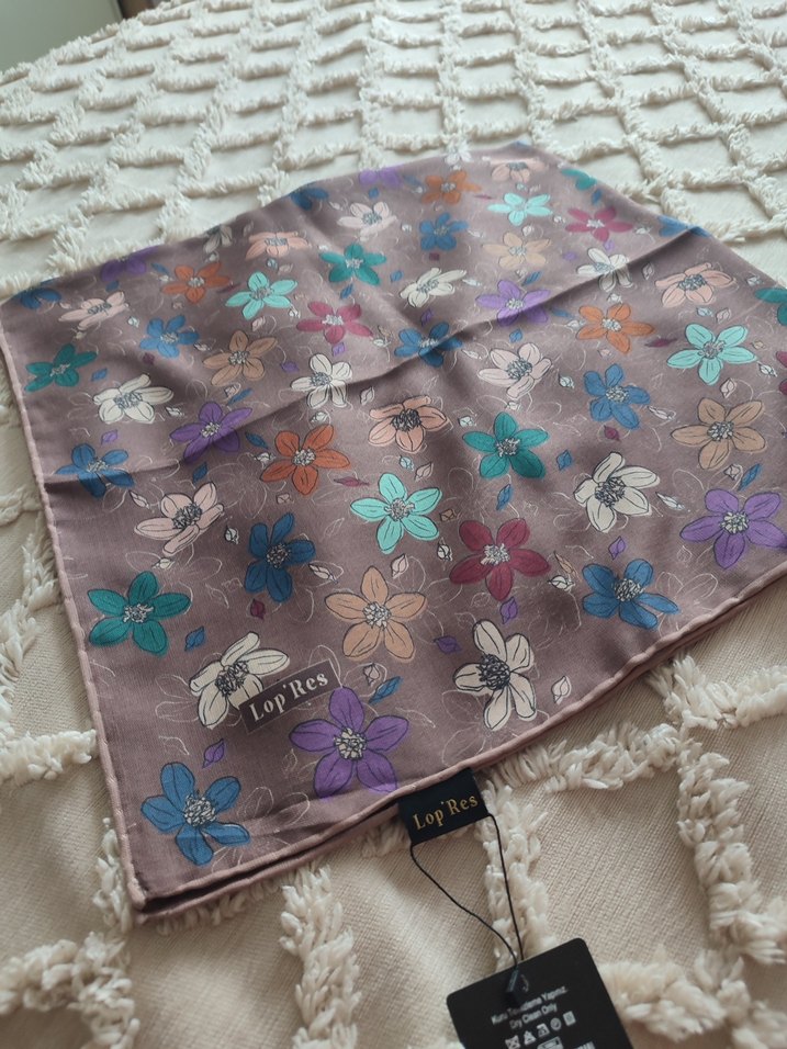 Bej renkli, pastel çiçek desenli ve dantel detaylı kadın fuları, yumuşak sentetik kumaştan yapılmıştır ve bohem Paris tarzını yansıtır.