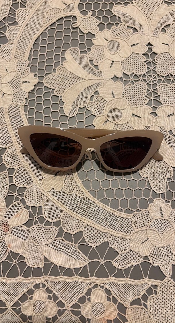 Bej renkli, kedi gözü tarzında kadın güneş gözlüğü. Dantel arka planıyla bohem ve retro bir hava katıyor.