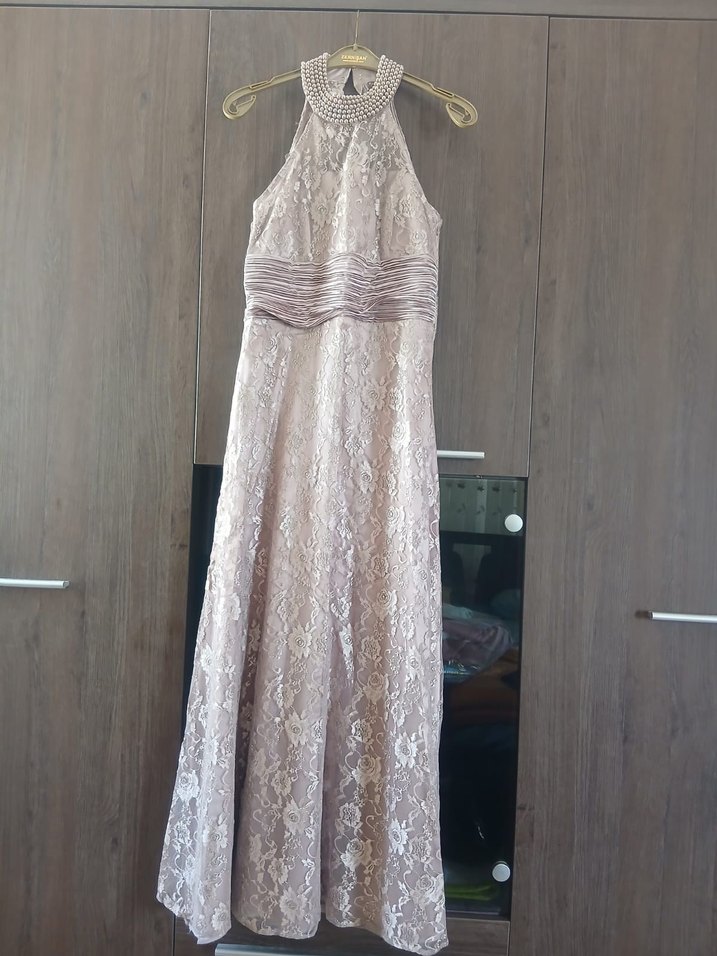Bej renkte, dantelli, uzun ve kolsuz abiye elbise.Halter yakalı ve gri tonlarında ince kemer detayı bulunur, klasik ve modern bir tarz sunar. Sorunu yok 1 kez giyildi