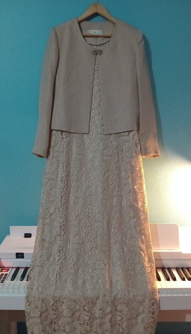 Bej renkte, uzun kollu ve regular fit kesime sahip, dantel detaylı kadın abiye elbise. Notched lapel yakalı ceketle vintage düğünler için klasik şıklık sunar.