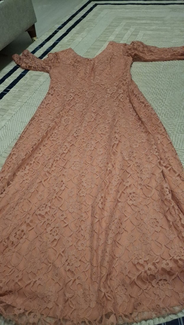 Bej renkli, dantelli ve uzun kollu bu elbise, tek parça uzun kesimi ve tekne yaka detayıyla modaya uygun bir vintage görünüm sunar. Yumuşak sentetik kumaştan yapılmıştır ve bohem tarzındadır. sadece bi kez giyildi