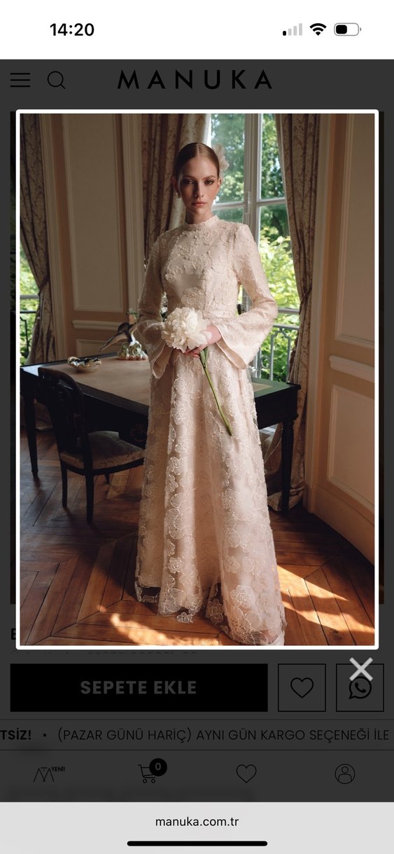 Bej renkte, dantel işlemeli uzun vintage abiye elbise, uzun kollu ve çentikli yaka detaylı, klasik şıklık sunar.