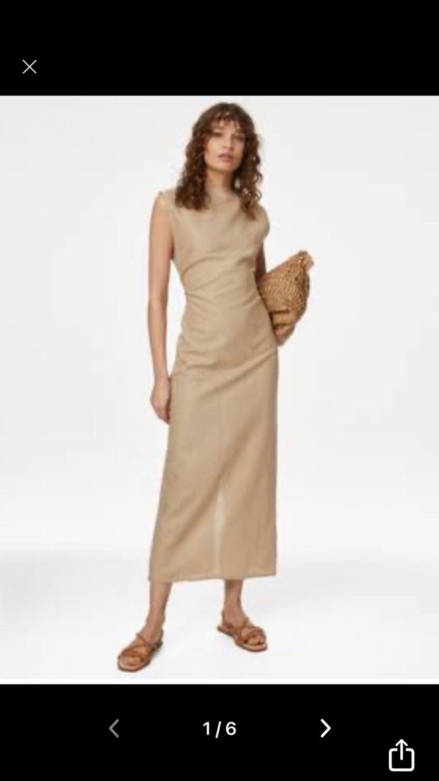 Bej keten kumaştan, yüksek yakalı ve kolsuz uzun elbise, sade ve normcore tarzıyla günlük kullanım için uygundur. Son iki resimde ölçüleri ve açıklama yazıyor