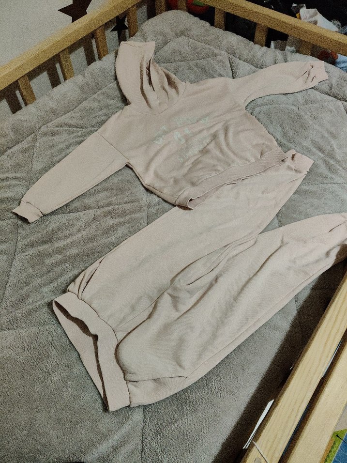 Bej renkte, rahat kesim kız çocuk eşofman takımı. Yumuşak keten kumaştan, uzun kollu ve bisiklet yaka, günlük sokak stili için uygun.