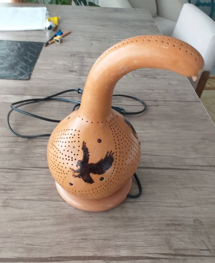 Bej renkte, kuş figürlü ve küçük deliklerle süslenmiş dekoratif lamba, sıcak bir ışık efekti sağlar. ️Su kabağından figürleri yakma sanatı ile yapılmıştır orjinal el yapımıdır.El emeğidir.Lambasıda içindedir.