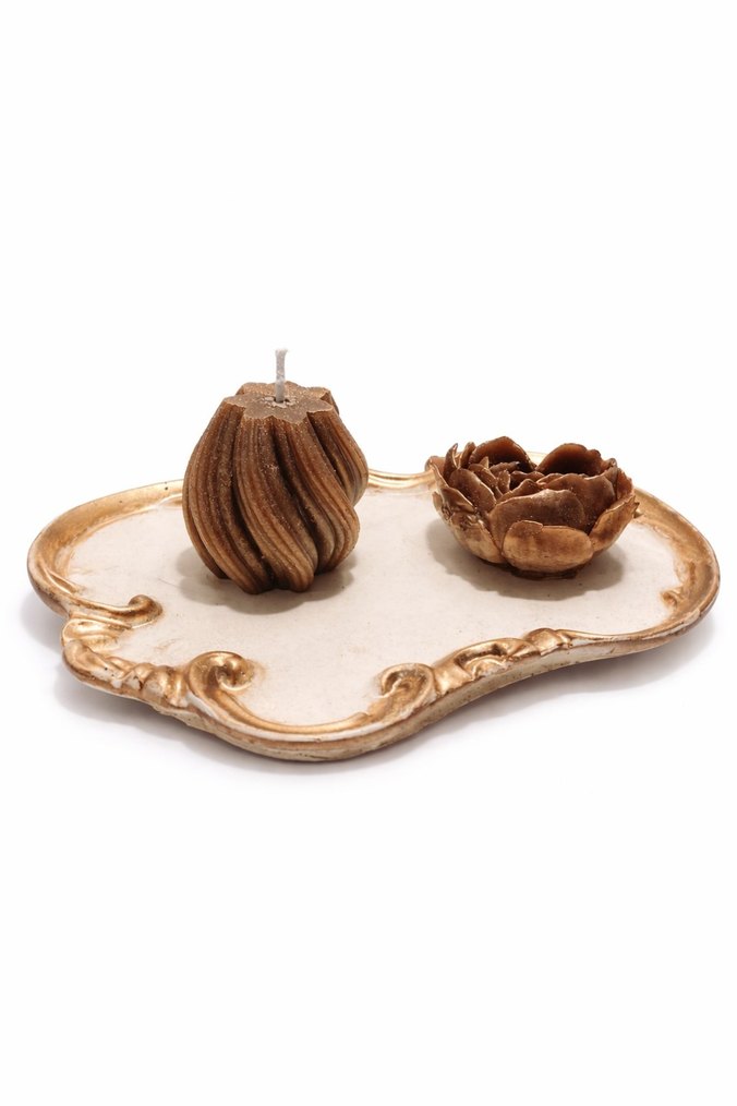 Bej renkli, detaylı desenlere sahip dekoratif mum ve mumluk seti. Dokulu mum ve çiçek şeklinde tutucu, süslü bir tepsi üzerinde yer alır. ️ Kokulu mum