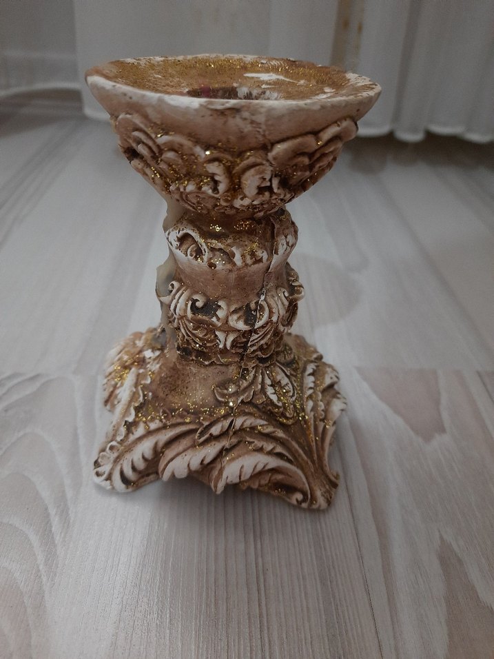 Bej renkli, detaylı süslemelere sahip dekoratif mumluk, klasik bir atmosfer yaratır. ️kullanılmıştır, yani mum lekeleri var. resimlerde görünüyor