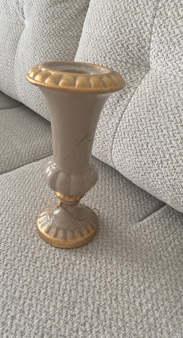 Bej renkte, gri detaylı ve altın süslemeli klasik şekilli dekoratif vazo.