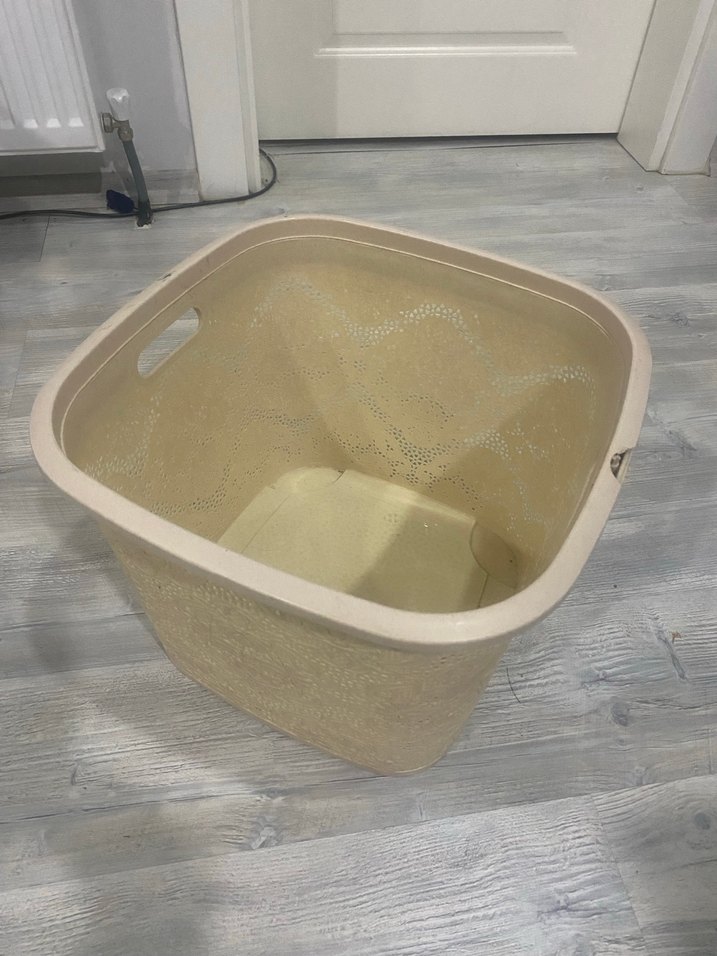 Delikli yan yüzeylere ve taşıma için kulplara sahip bej çamaşır sepeti. Hafif ve düzen için kullanışlı. Küçük bir kırılmışlık mevcut iade yoktur