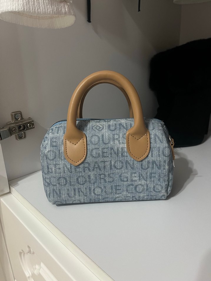 Bej renkli denim kadın el çantası, baskılı yazılar ve sağlam kulplarla günlük kullanıma uygun rahat ve şık bir tasarıma sahiptir. Küçük el çantası bir kez kullanıldı tertemiz