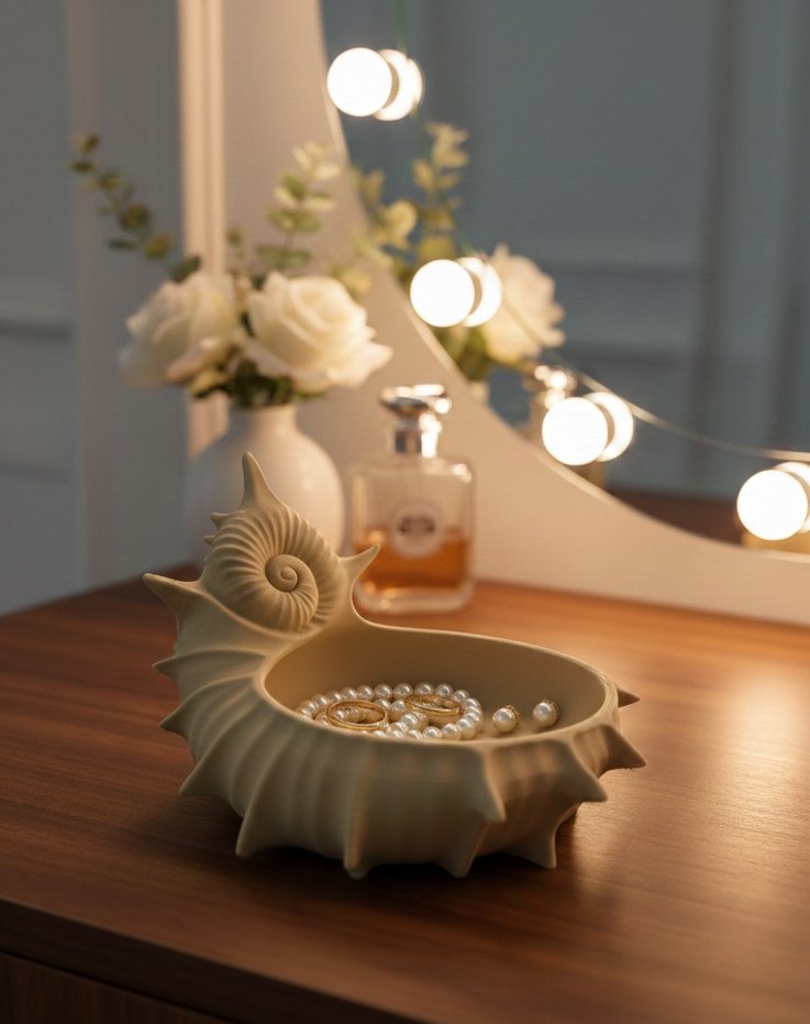 Bej renkte deniz kabuğu şeklinde dekoratif tabak, takı veya küçük eşyalar için uygundur. Hafif rengiyle mekâna yumuşaklık katar.