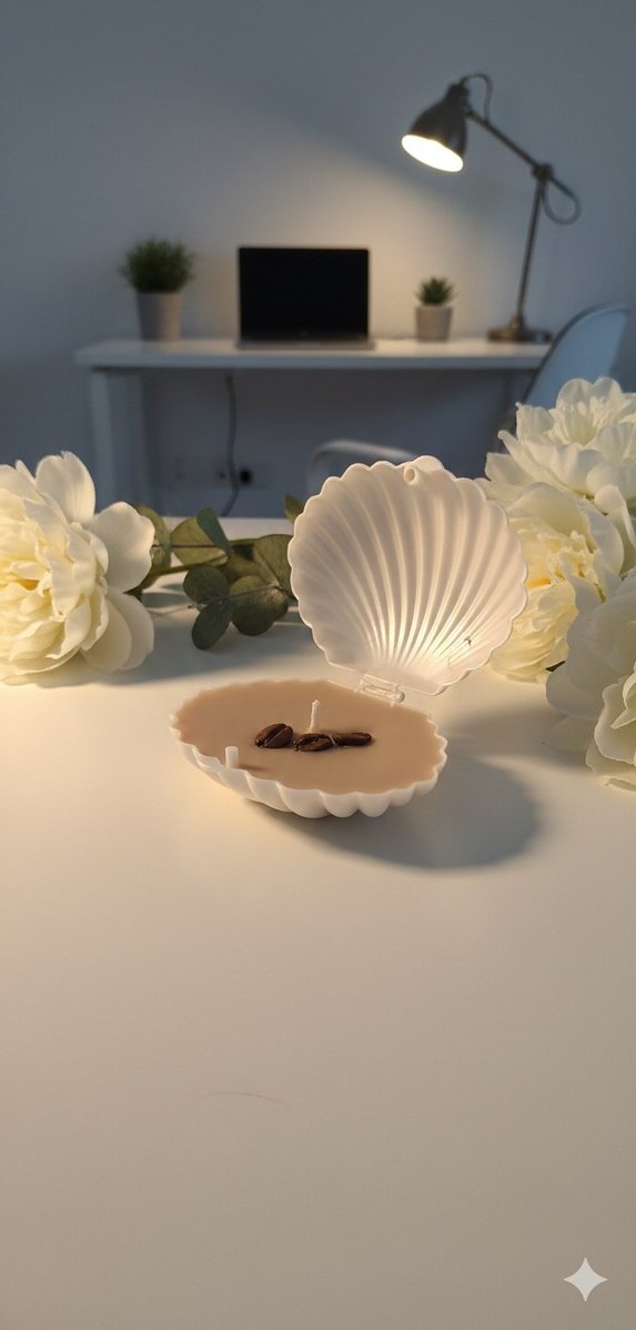 Bej renkte deniz kabuğu şeklinde tasarlanmış mum, üstünde kahve çekirdekleri ile şık bir dekoratif ürün. ️