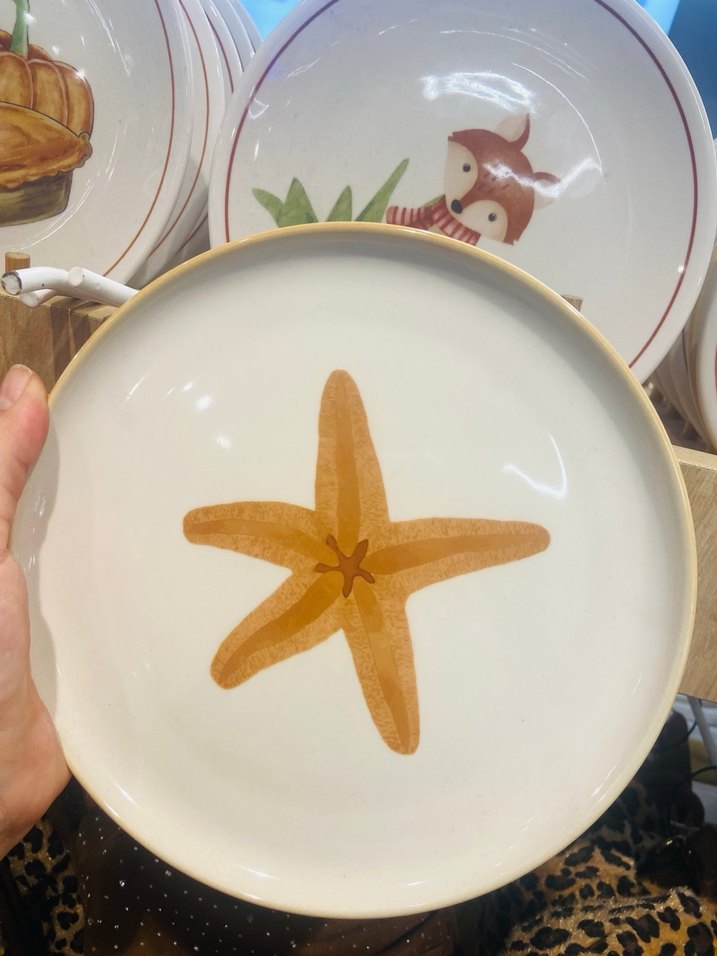 Bej renkte, ortasında deniz yıldızı deseni bulunan tabak. Sahil temalı sofralar için uygun. 20 cm pasta tabağı afet fiyatıdır.