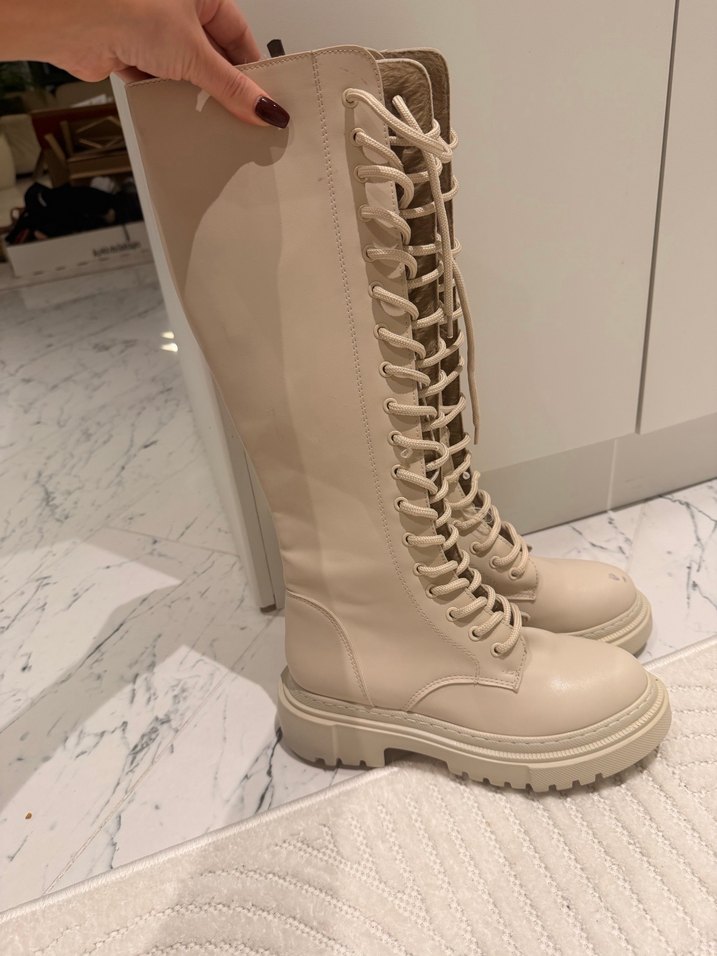 Bej renkte, bağcıklı önü ve ince topuklu deri dizüstü kadın çizme. Günlük kullanıma uygun, pastel tonlarda ve trend sokak stiline uygun. Hiç giyilmemiştir üstüne gelen üründen dolayı önde bi boya geçmiş silince çıkabilir