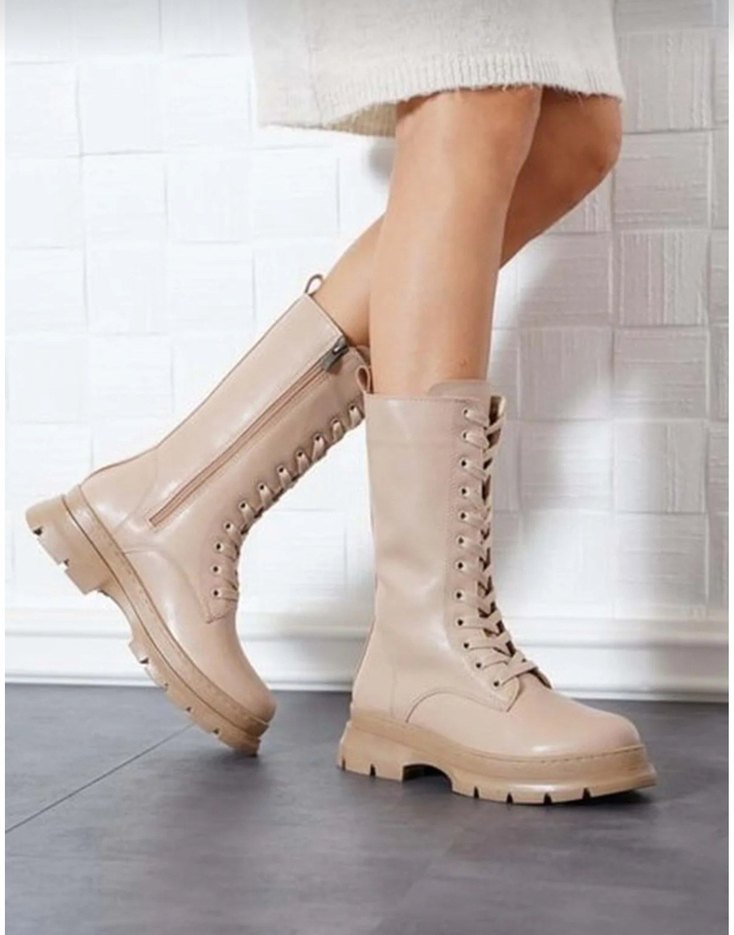 Bej renk, blok topuklu, bağcıklı deri kadın botu. Günlük kullanım için çağdaş tarzda, trend sokak stiliyle uyumlu.