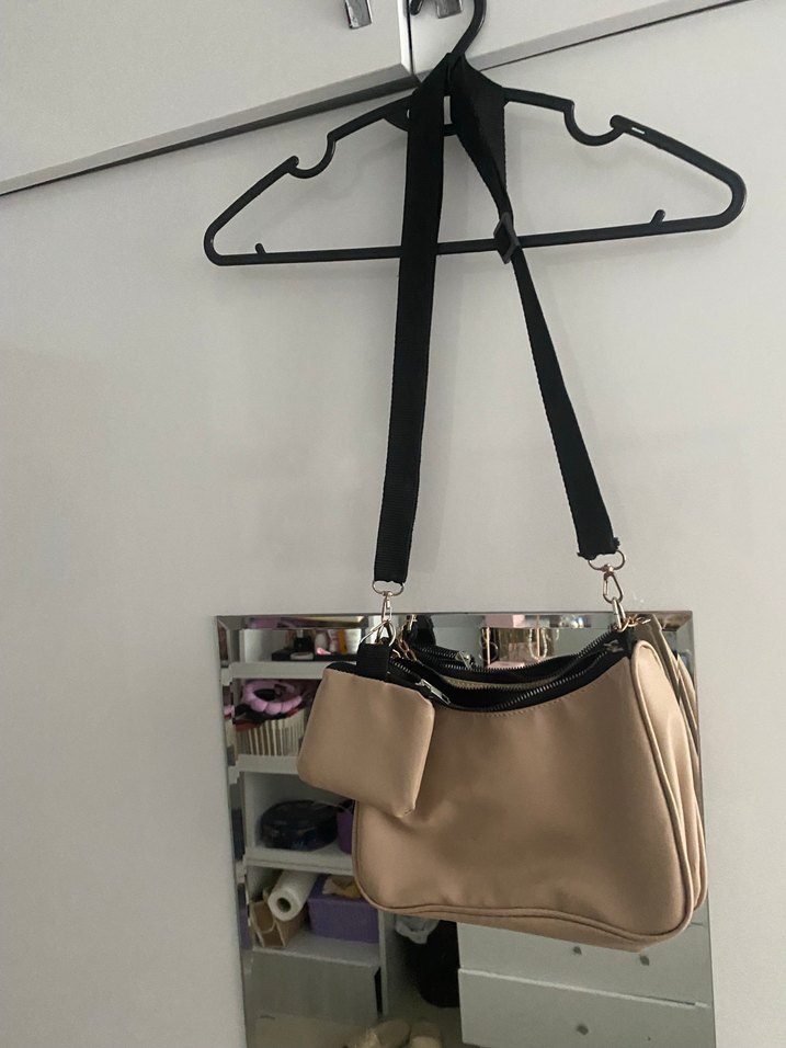 Baskılı desene sahip bej deri kadın çantası, tokalı ve ayarlanabilir askılı. Sokak stiline uygun, günlük kullanım için ideal.
