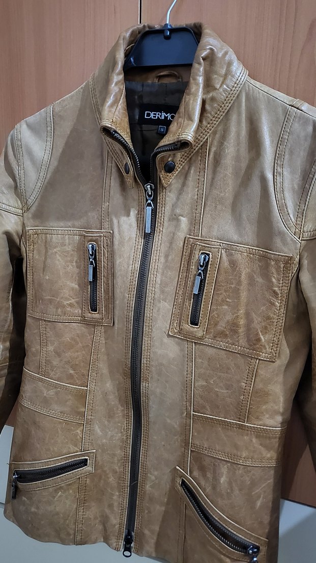 Bej renk, fermuarlı cepli ve kesimli yaka detaylı deri biker ceket, günlük sokak stili için uygundur. Marka: DERIM.
