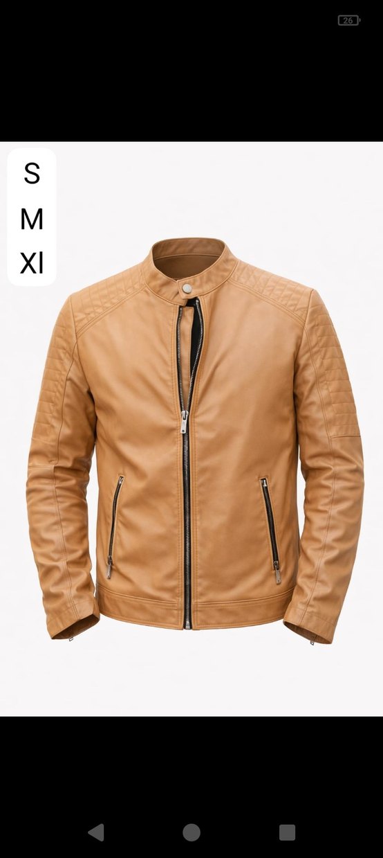 Bej deri biker ceket, çıtçıtlı yakalı ve fermuarlı ön detaylıdır. Uzun kollu, parlak görünümlü ve rahat kesimdir. Günlük kullanıma uygundur.