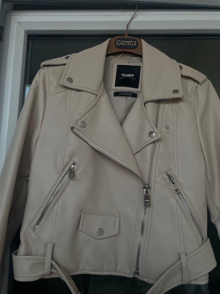 Bej renkli deri biker ceket, yakasında kesik yakalı ve fermuarlı detaylara sahiptir. Ürün bir kez giyilmiştir. Hiç bir yerinde deforme yoktur.