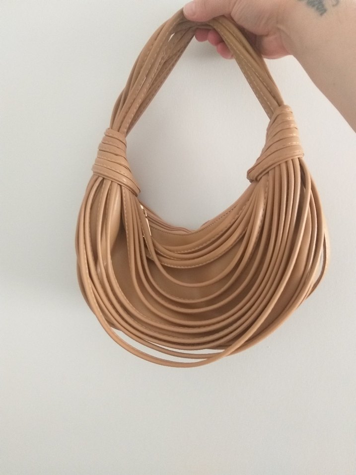 Bej renkli deri kadın çanta, elastik detaylı ve bohem tarzda, günlük kullanıma uygun minimal ve şık tasarım.