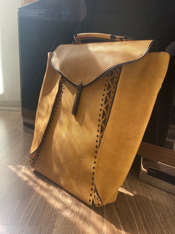 Parlak bej deri, tokalı kapaklı, vintage bohem tarzında desen içermeyen günlük kullanıma uygun sırt çantası.
