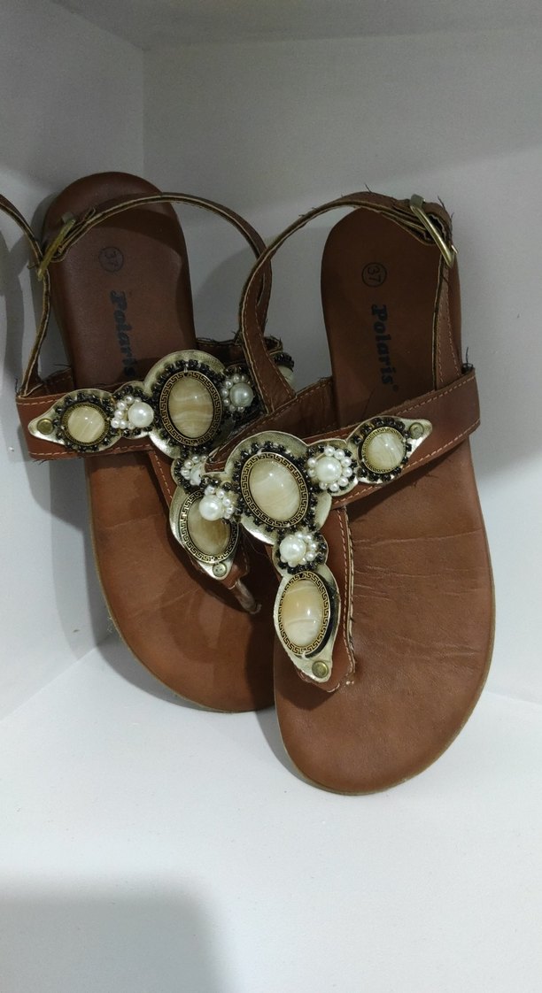 Bej deri, dolgu topuklu kadın sandaletler, boncuk detaylı ve tokalı kayışlıdır. Bohem tarzı yansıtır, günlük kullanıma uygundur.