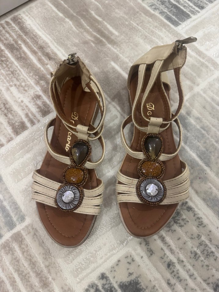 Bej deri Boncuklu Kadın Sandalet
