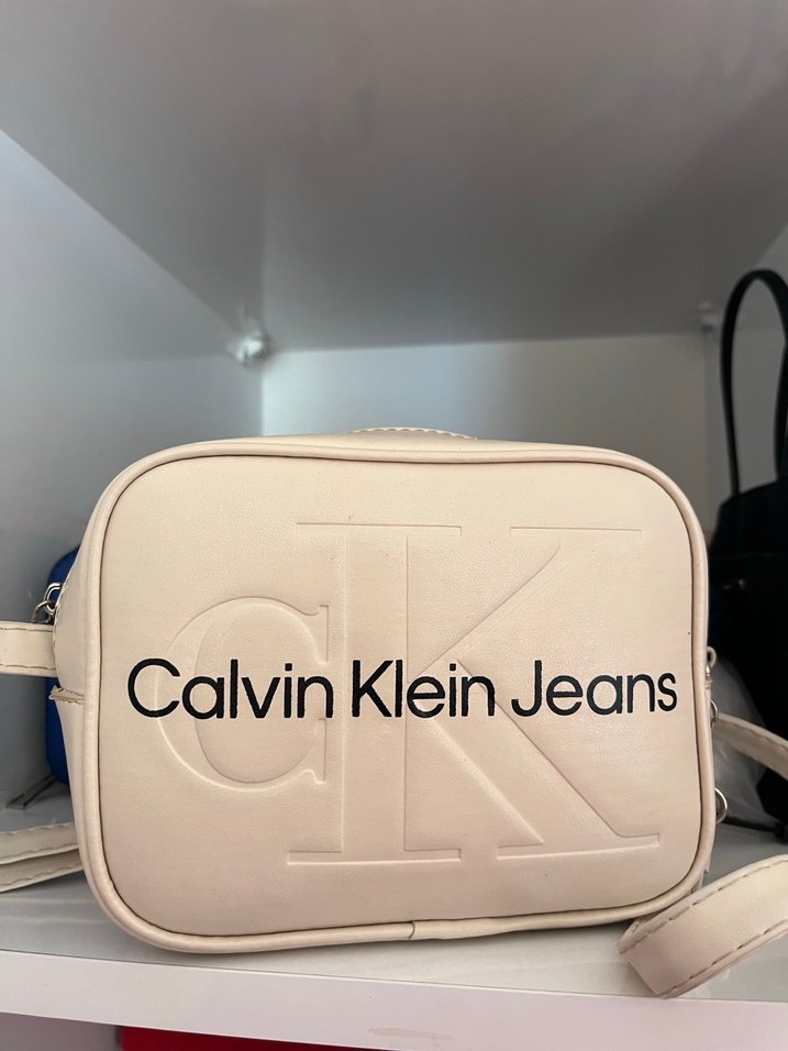 Bej deri, baskılı Calvin Klein Jeans logosu ve tokalı askısı olan çapraz çanta. Günlük kullanım için uygun, trend sokak stili görünümü sağlar. Yeni gibi hiç bir sorunu yok