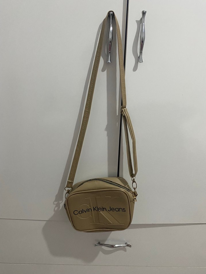 Calvin Klein'in bej deri çapraz çantası, baskılı logo ve ayarlanabilir kemer kayışıyla günlük kullanıma uygundur.