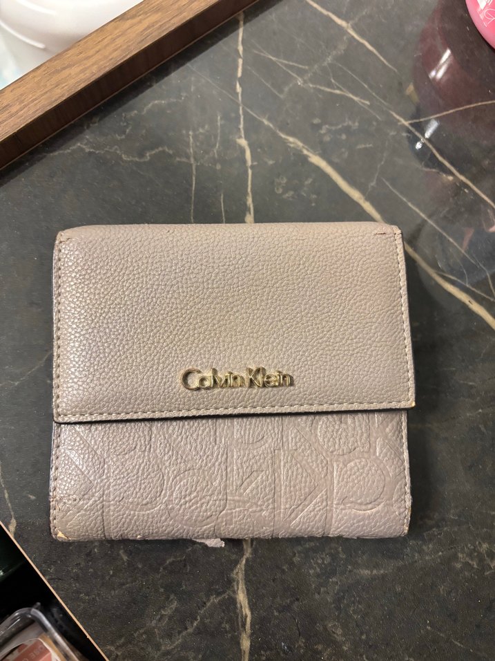 Bej deri Calvin Klein kadın cüzdan, baskılı desen ve tokalı tasarıma sahip, görsellerde belirtmiş olduğum gibi bazı yerlerinde derilerde aşınma söz konusu çok fazla ayrım yapılmazsa aşınmalar pek belli olmuyor