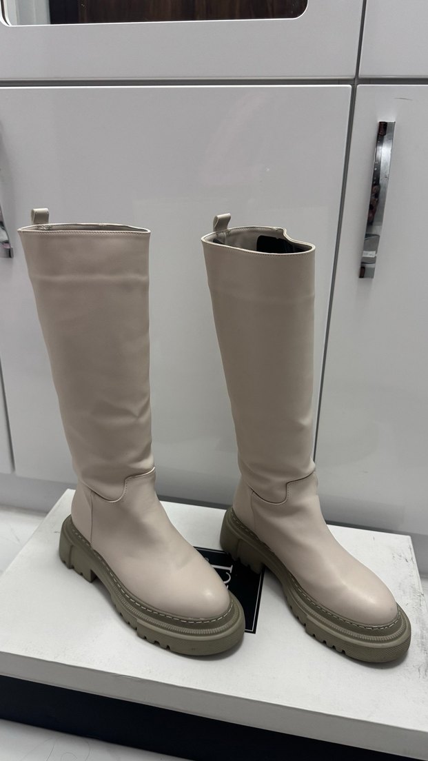 Bej deri diz boyu çizme, ince topuklu ve kemer detaylı, kalın tabanlı. Günlük kullanıma uygun, modern sokak stili çizmesi. İnci marka