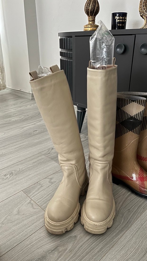 Bej Deri Diz Boyu Kadın Çizme