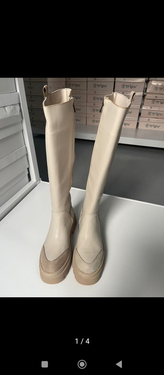 Bej deri dizüstü ince topuklu, kemerli çizme, modern ve günlük sokak stiline uygun.