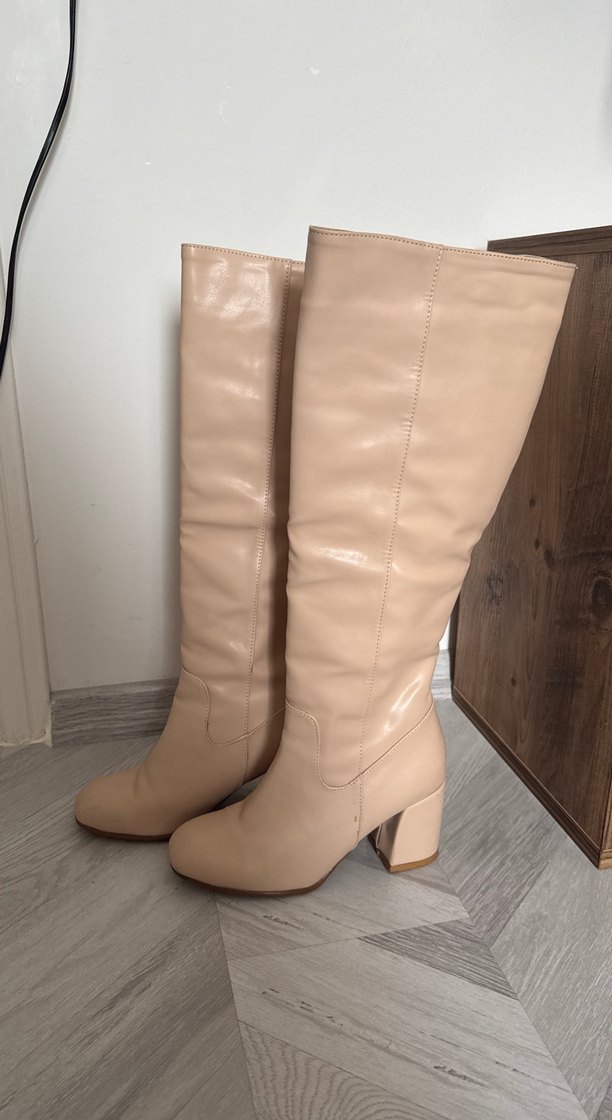 Topuk boyu 7,5 cm fotograflarda dikiş yerlerinde ufak soyulmaları gösterdim sarı lekeler yapıştırıcı kalıntısı 1-2 kez giyildi bej pudra arası bir rengi var