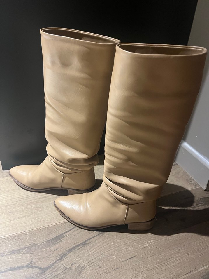 Bej renkli deri dizüstü çizme, blok topuklu ve desen içermeyen tasarıma sahiptir. Pastel tonuyla rahat ve şık, günlük sokak stili için uygundur.