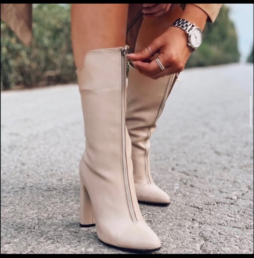 Bej deri dizüstü çizmeler, stiletto topuklu ve ön fermuarlı, sokak stili için uygundur.