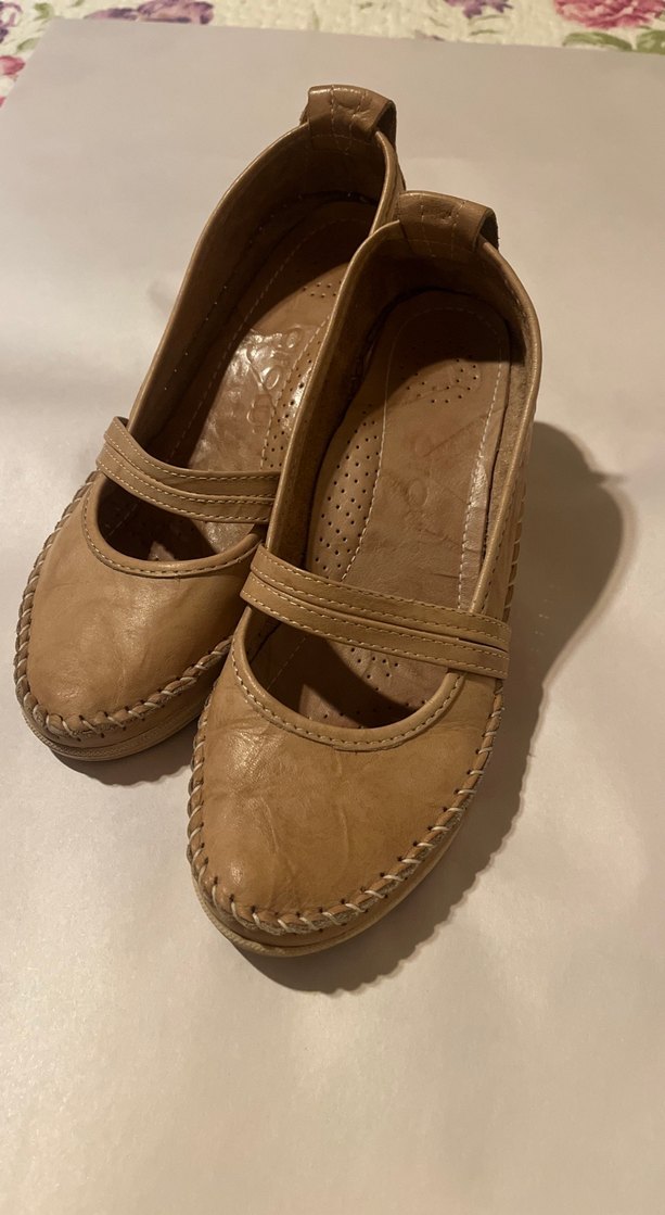Bej renkte deri kadın babetler, dolgu topuklu ve tokalı bantlıdır. Minimalist ve klasik tarzda, günlük kullanım için uygundur.