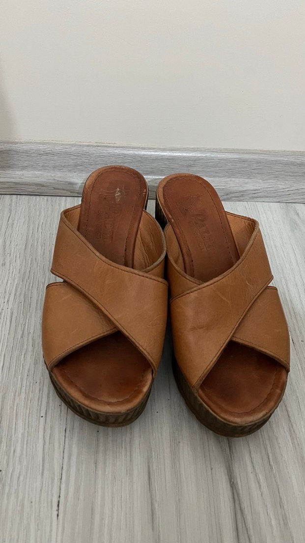 Bej deri dolgu topuklu kadın terlik, parlak yüzeyli, tokalı tasarıma sahip. Minimalist ve bohem tarzlar için uygundur.