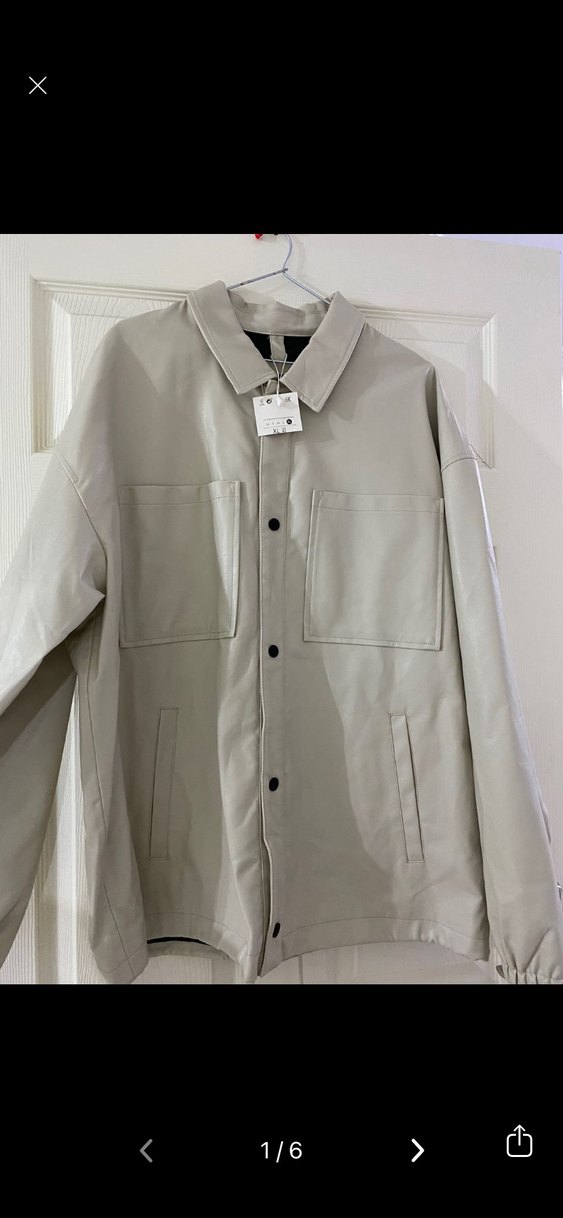 Bej renkli deri ceket, düğmeli ve yakalıdır. Düzenli kesim, uzun kollu ve ön ceplidir, günlük sokak stili için uygundur.