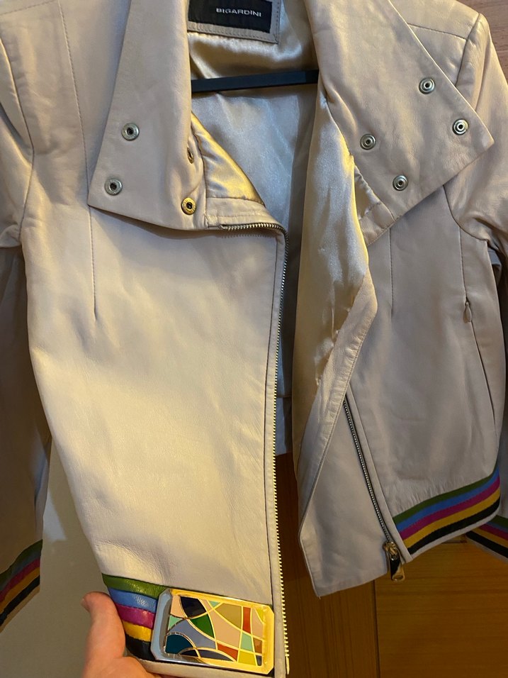 Bej deri, düğmeli, yakalı ve strappy kollu kadın ceket, renkli detaylarla sokak stili için uygun. Orjinal marka ve hakiki deridir