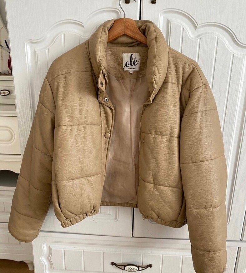 Bej deri düğmeli ceket, kesik yaka ve uzun kolludur. Parlak yüzeyi, bol kesimi ve midi boyu ile günlük rahat kullanıma uygundur.