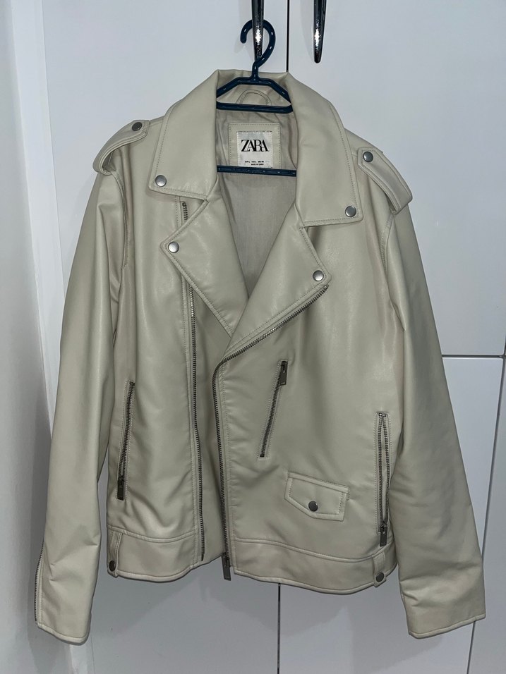 ZARA markalı bej deri ceket, çıtçıtlı yakalı, fermuarlı cepli ve normal kesimdir, günlük kullanıma uygundur. 2 defa giyildi. L bedendir.