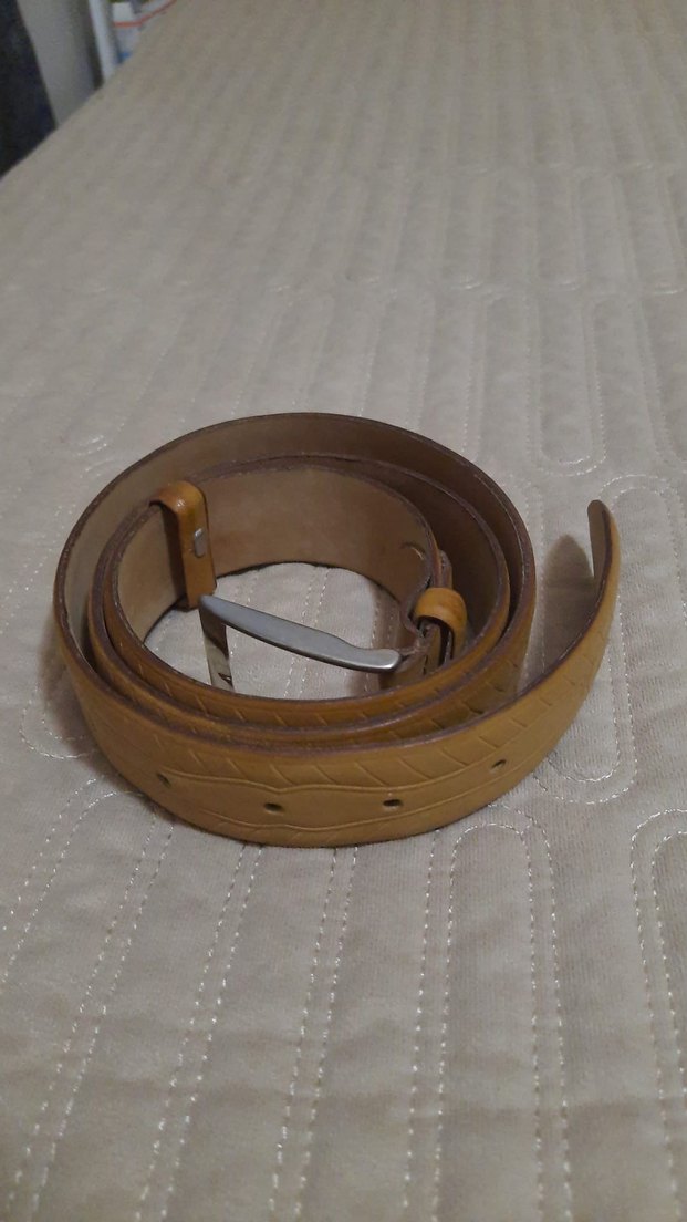 Bej renkte, deri erkek kemeri, tokalı ve klasik tarzda. Vintage ve eski moda bir görünüm sunar, sade ve gri tonlar içerir.
