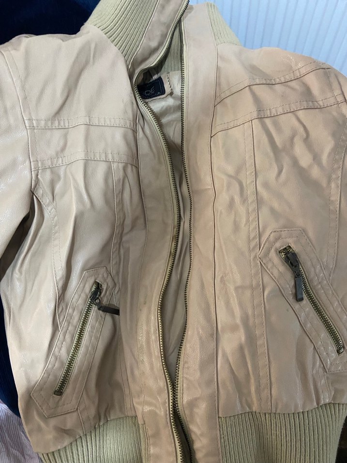 Bej renk, fermuarlı ve deri ceket. Notlu yaka ve fitted kesimiyle günlük ve sokak stiline uygun.