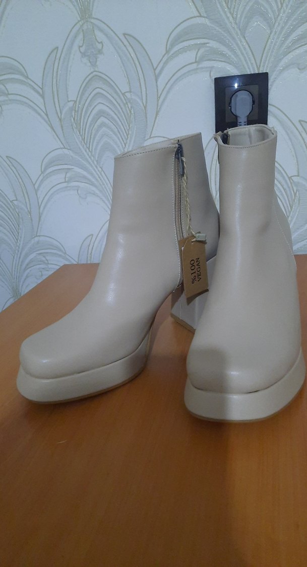 Bej deri kadın botu, blok topuklu ve fermuarlı. Düz ve desensiz tasarımıyla normcore stile uygun, günlük kullanıma uygun.