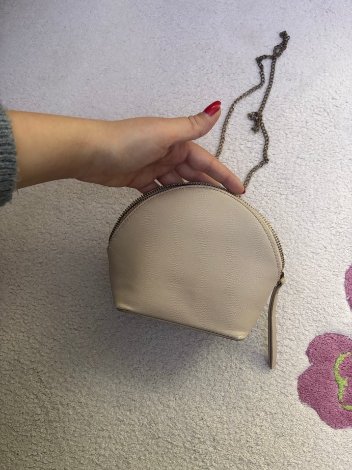 Bej deri, fermuarlı kapanış ve zincir askılı, günlük kullanıma uygun sade ve çağdaş tarzda kadın çantası.